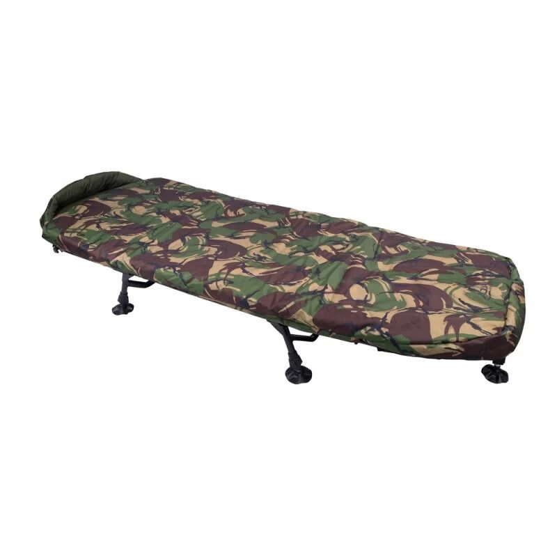 Deze unieke System bedchair van Aqua products is de eerste in zijn soort met DPM camouflage print. Het bed is zo ontworpen dat vrijwel alle wensen van een karpervisser vervult zullen worden, het biedt ultieme mobiliteit en optimaal comfort. Het gewicht van 11kg is zo minimaal dat deze bedchair ook in de kortste sessies met gemak mee te nemen is. Het is een aluminium constructie met 6 poten. Het scharnier is zo gemaakt dat het resulteert in een volledig vlak profiel en compacte transport afmeting. De bedchair is uitgerust met een gepatenteerd pootmechanisme, door op de knop de drukken schuift de poot automatisch naar onderen. De slaapzak is handig te verwijderen met gebruik van klittenbandstroken.