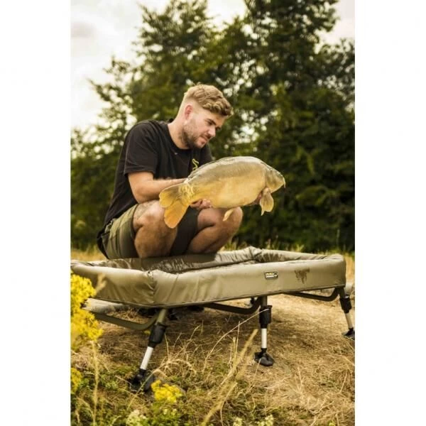De Stormshield Safeguard onthaakmatten zijn de nieuwste versie van een van onze best verkochte en meest populaire productlijnen tot nu toe. In de 5 jaar sinds de release van de originele Safeguards worden ze algemeen beschouwd als de veiligste, beste kwaliteit en het gemakkelijkst te gebruiken op de markt. Met de cultus van het Safeguard assortiment vonden we dat het tijd was om te updaten en te verbeteren waar mogelijk dankzij de vooruitgang in de materialen. De Stormshield Safeguards zijn voorzien van onze unieke en super robuuste Stormshield stof, die in tegenstelling tot veel andere tapijtverzorgingsproducten, niet zal delamineren na verloop van tijd, waardoor uw Stormshield Safeguard veel langer meegaat dan sommige andere rivaliserende producten. De bovenkant van het frame is bedekt met een royale hoeveelheid gewatteerde stof, zodat je karpers niet beschadigd raken en veilig blijven tijdens het loshaken, wegen en het maken van alle belangrijke vangsten. Het lichtgewicht aluminium frame is afgewerkt in onze kaki groene kleur en de verstelbare poten zijn nu voorzien van de nieuwe en verbeterde Rock-Steady Systeem, zodat u uw Safeguard snel en eenvoudig kunt egaliseren, zelfs op de meest oneffenheden in de ondergrond. De gaasafvoerroosters aan elk uiteinde van de mat zorgen ervoor dat overtollig water snel wordt afgevoerd. De Stormshield Safeguards zijn verkrijgbaar in twee maten, standaard en XL, en beide worden geleverd met een gemakkelijke draagtas.