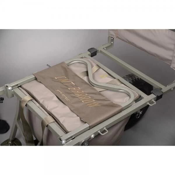 De Strategy CMT Barrow is extreem compact op te vouwen. Hij is smaller in vergelijking met de standaard, Daarmee is de Barrow geschikt voor het lopen over zeer smalle paden en in oeverzones. Doordat zijn lengte verstelbaar is is hij perfect af te stemmen op de lading. Naast het voorste schot heeft de CMT Barrow ook een inklapbaar achterschot voor extra ondersteuning, indien gewenst. De Strategy CMT barrow wordt geleverd in een tas met Frame, welke eenvoudig in de Barrow gehangen kan worden.